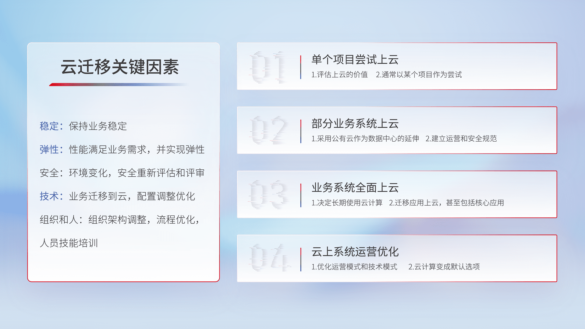 结合实际业务,,,,从规划设计、、云平台选型、、、、云原生改造、、数据迁移、、、集成交付,,迁移全过程为客户识别最佳上云路径,,,,做好风险识别管理,,,设计网络架构、、、身份权限、、、安全审计合规、、、、操作审计、、、日志审计、、、、监控告警策略、、多站点容灾设计等,,,对云上基础设施进行整体规划,,,提升IT治理水平,,以满足弹性、、高可用、、、高性能的需求。。。